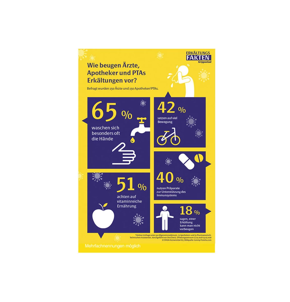 - 40 % der befragten Experten greifen in der Erkältungssaison zu Präparaten zur Unterstützung des Immunsystems. Allerdings nutzen nur 21 % der Ärzte immunstärkende Präparate, bei den Apothekern sind es ganze 65 %.