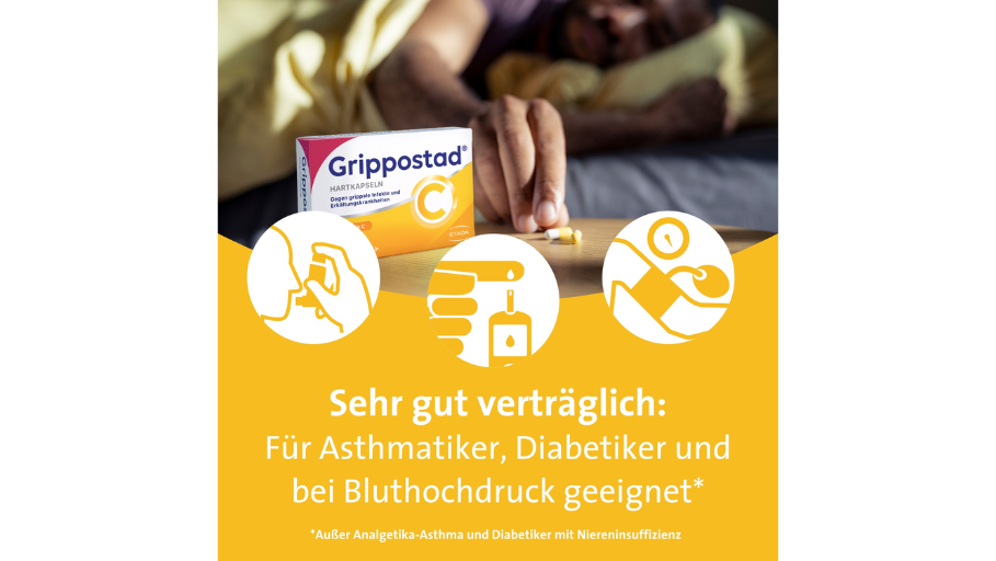 Grippostad® C ist gut verträglich und auch für Risikopatienten geeignet. Dadurch kann es auch von Diabetikern, Asthmatikern sowie Patienten mit Bluthochdruck oder Herzinsuffizienz eingenommen werden.* Die Wirksamkeit und Verträglichkeit von Grippostad® C wurde in klinischen Studien bestätigt. Schwangere oder stillende Frauen, sollten Grippostad® C nicht einnehmen.