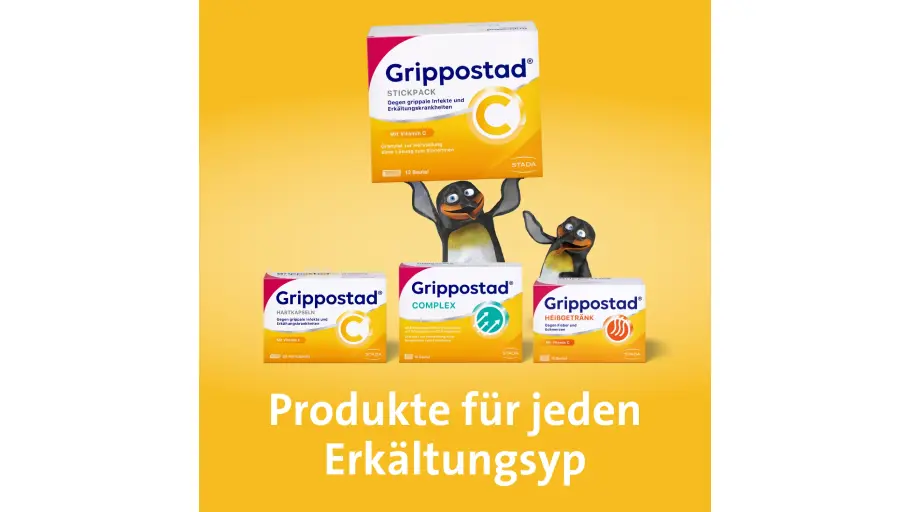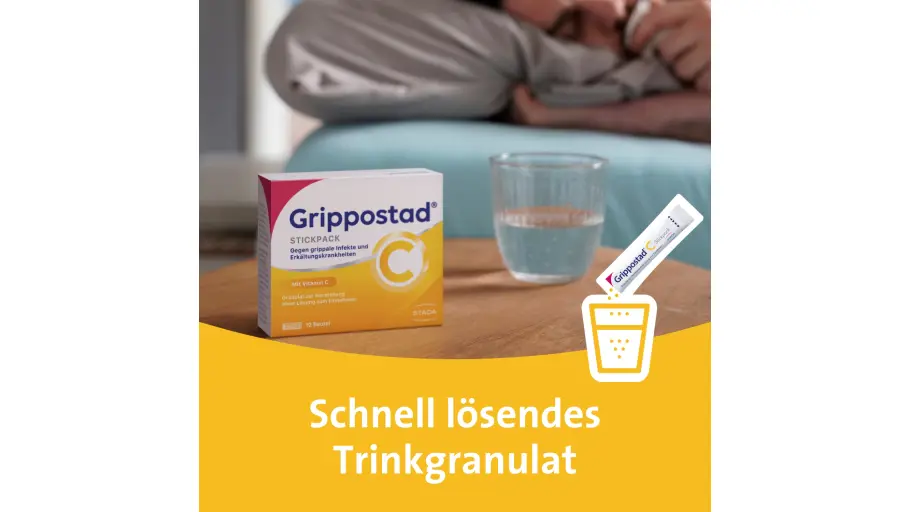 Grippostad® C, Deutschlands Nr.1 Erkältungsmarke mit Vitamin C*, gibt es nicht nur als Kapsel. Als Grippostad® C Stickpack steht die bewährte 4er-Wirkstoffkombination aus Paracetamol, Chlorphenamin, Coffein und Vitamin C in Form eines Trinkgranulats auch denjenigen zur Verfügung, die keine Kapsel schlucken wollen oder können. Aber dennoch im Falle einer Erkältung die typischen Erkältungssymptome behandeln möchten. Das Plus für Sie: Zusätzlich zur Bekämpfung der Symptome wird der wichtige Flüssigkeitsausgleich im Rahmen einer Erkältung unterstützt. Außerdem enthält das Trinkgranulat keine tierischen Inhaltsstoffe und ist somit auch gut für Vegetarier und Veganer geeignet.