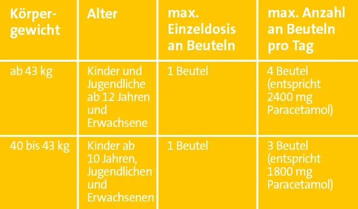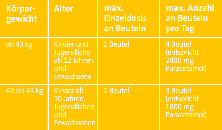 Paracetamol wird in Abhängigkeit von Alter und Körpergewicht dosiert. Die Einnahme kann in Abständen von 6 bis 8 Stunden wiederholt werden, d.h. 3 bis 4 Einzeldosen pro Tag. Der Abstand zwischen den einzelnen Einnahmen sollte jedoch 6 Stunden nicht unterschreiten.