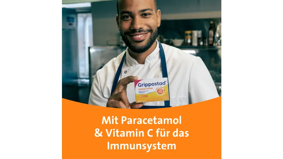 Kopf- und Gliederschmerzen sowie Fieber sind mitunter die häufigsten Beschwerden einer Erkältung, die meist zu Beginn auftreten. Grippostad® Heißgetränk wirkt dank Paracetamol effektiv bei Fieber und Schmerzen und unterstützt das Immunsystem mit Vitamin C. Als Heißgetränk schenkt es angenehme Wärme und führt wichtige Flüssigkeit zu.