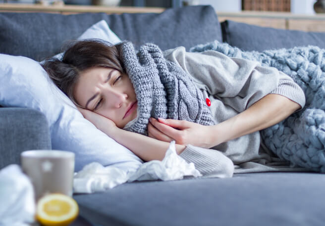 Wenn Sie während einer Erkältung flach auf dem Rücken schlafen, werden die Atemwege oftmals durch die Verschleimung blockiert und der Hustenreiz setzt ein. Eine erhöhte Schlafposition erleichtert dagegen das Atmen und sorgt dafür, dass überschüssiges Sekret besser abließen kann. Um den Kopf beim Schlafen höher zu lagern, können Sie entweder Ihren Lattenrost entsprechend verstellen oder Sie nutzen zusätzliche Kissen. Durch die leichte Schräglage verringern Sie den Druck auf die Nebenhöhlen – das Sekret kann besser abfließen und das Atmen fällt wieder leichter.